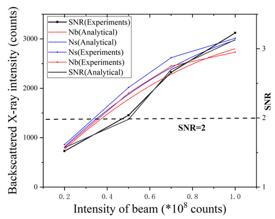 As shown in Figure 13, with the X-ray beam intensity increased, the detected X-ray intensities (Ns and Nb) increased. The measurement noise σ and the difference of detected X-ray intensity with/without core panel ∆N also increased. However, due to the constant depth of irradiated volume determined by the X-ray photon energy, the reduction effect of less X-ray intensity reaching the irradiated volume gradually approached the increment effect of the depth of irradiated volume in the core panel on the detected intensity difference ∆N with increasing X-ray beam intensity. In contrast, the increment of noise σ kept increasing with the increment of X-ray beam intensity. This would cause a variable gradient of SNR of detection and influence the detection accuracy.