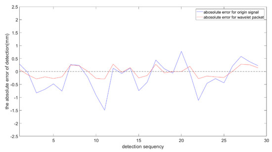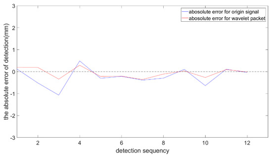 Figure 16 and Table 5 show the detection errors of the weld center from the original signal and from the processed signal based on wavelet packet, respectively. The blue curve indicates the absolute error of the detection before signal processing. The maximum absolute value of the errors was 1.527 mm. The red curve indicates the absolute error of the detection after signal processing. After the signal processing, the detection error was significantly reduced and the maximum absolute value was reduced to 0.287 mm, which is accurate enough to meet the detection requirements for a 3-mm-thick specimen.