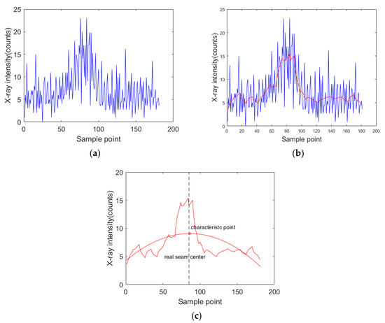 After denoising and correction, curve fitting was performed on the denoised X-ray intensity signals by using a least squares method, and then the characteristic point representing the center position of the weld in the fitted curve was determined, as shown in Figure 9. The characteristic point was the maximum value of the fitting curve of the denoised X-ray intensity signals. The absolute error of detection was determined by comparing the derived weld position with the real calibrated seam center.