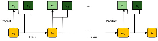 In contrast to offline learning approaches, online learning algorithms process a potentially infinite sequence of predictors (xi) and outputs (yi) as they arrive one after the other [28]. The learning objective is to predict the current label yt for a given input xt, using the previously learned model ht−1, hence the prediction is computed as Another difference with offline learning is that training and testing datasets are not completely disjointed, rather each instance sample is used for model testing and in the next step for model training. In Figure 2, we show a scheme of a typical online algorithm. Each time the predictor function h is constructed on past received information and it only predicts the following label .