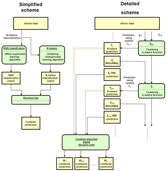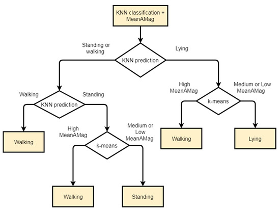As stated, this study proposes an approach that combines the classification labels from the offline KNN algorithm (implemented via the PME) and the online K-means algorithm, which uses the online MeanAMag calculation as an input, with both acting as inputs to a set of decision rules. An implementation scheme of the overall algorithmic approach is shown in Figure 4 and described in the following steps: