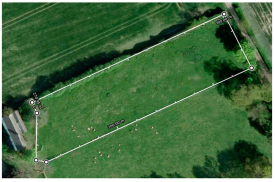 Before starting the main trial, a pilot study was conducted for 3 days to check the research protocols described below and also to test battery life and operation of the Intel® SE C1000 device in the field. Battery life of the 270 mAh battery during the pilot was 2.4 days (±2 h) as no restrictions/strategies were enforced. Ethical permission was obtained for the School of Veterinary Medicine and Science, University of Nottingham (unique reference number 1481 150603). For the main trial in this study, data was collected for 39 days from 19 July 2017 to 4 October 2017. A total of 26 sheep were selected via stratified random sampling (age) from a flock of 140 animals at the University of Nottingham. Assessment of body condition, age and breed was done on the first day of the trial. Body condition scoring of sheep is simply a means of assessing the degree of fatness or condition of the living animal and was scored using UK industry guidelines [33]. The selected sheep had various body condition scores ranging from 2.5 to 4.5 and an age ranging from 1 to 4 years. The breeds of the sheep were Lleyn crosses (13 individuals), Aberfield cross (5 individuals), Exlana crosses (3 individuals), Texel crosses (4 individuals) and a Berichon du Cher (1 individual). Sheep were kept in a rectangular 0.75-acre field with a 270 m perimeter, where observational recordings were taking place (Figure 6). Individual identification was facilitated by spraying a number between 1 and 26 on an animal’s side. Numbers were sprayed regularly (every 2 weeks), to aid identification. From the total number of sheep kept in this field only 17 sheep were used to collect sensor and observation data due to limited human resources available to observe all the animals in the field. Sheep were selected on the basis of including a wide range of body condition, age and breeds.