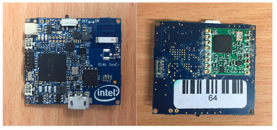 Sensor data was collected using a custom-made wearable device (Figure 7), based on the Intel®Quark™ SE C1000 microcontroller. In summary, the device encompassed flash memory, a low power wide area (LPWA) radio module, a tri-axial accelerometer and tri-axial gyroscope and a Pattern Matching Engine (PME). Full details of the configuration of the device can be found in Walton et al. [8]. The devices were attached to a light-weight Li-Po battery 270 mAh Li-ion battery.