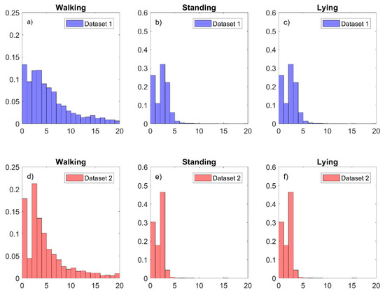 Distribution of the MeanAMag for our previously collected dataset [8] (dataset 1) and for this study (dataset 2). The plot shows the distribution change between the two studies for the three different behaviours. (a–c) show the distributions of the MeanAMag for walking, standing and lying using collected dataset [8], (d–f) show the distribution of the MeanAMag for this study.