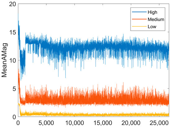 where represents the acceleration for each sample point at the axes x, y, and z, respectively. To obtain the discretised version of the MeanAMag, the value of gravity was subtracted from the and then the values were discretised in a range between 1 and 20. Sample frequency for the accelerometer and gyroscope were set to 16 Hz. The discretised version of the MeanAMag represent a discretised version of the well-known “dynamic body acceleration”, which has been used effectively as a proxy of energy expenditure in animals [31] and as a one of the only two feature characteristics required to classify different behaviours in cows [32]. Additionally, the discretised MeanAMag calculation supports low computational complexity and demonstrates observable differences across the different behaviours from the previously collected data [8], as shown in Figure 3.