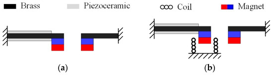 Considering that the MHEH is excited by low-frequency, small-amplitude vibration sources, the following assumptions are made: (1) magnets are regarded as rigid mass points with no moment of inertia; (2) the substrate and the piezoelectric layers are well attached to ignore the influence of the adhesive layer; (3) the cantilever beam is regarded as a Euler–Bernoulli beam, regardless of the moment of inertia and shear deformation; (4) the electric field in the piezoelectric layers is uniformly distributed along the thickness direction (z-axis direction); (5) two magnets vibrate along the vertical direction with no horizontal displacements, which are also axially aligned with the induction coils located in the bottom. The piezoelectric layers work at d31 mode. As shown in Figure 1, two magnets have the same magnetization directions.