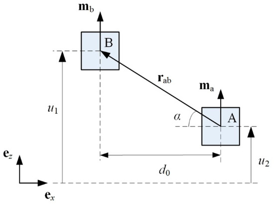 The magnetic interaction changes the equivalent spring stiffnesses of the piezoelectric and magnetic oscillators. As a result, the resonant frequency and generating performance of the MHEH can be tuned by varying the separation distance between two magnets. Magnetic force between two magnets can be calculated based on the dipole–dipole model [25]. The two magnets have the same geometrical dimensions. As illustrated in Figure 2, the magnetic moment vectors of magnets A and B, respectively are ma and mb. The initial separation distance between two magnetic dipoles is d0. At a given time, the vertical displacements of magnet A and B are u2 and u1, respectively. The distance vector between two dipoles is rab.