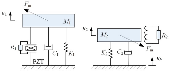 Here only the first modes of two cantilevered beams are considered. Based on the linear piezoelectric equations, Euler–Bernoulli beam theory, and Faraday’s law [27,28], the electromechanical coupling model of the MHEH subjected to harmonic excitation is expressed as