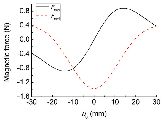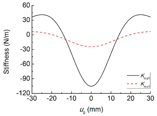 Figure 4 shows the vertical and horizontal magnetic forces for different values of transverse displacement difference u0. In the range of −19.5 mm~19.5 mm, the horizontal magnetic force acts as a compressive force on the piezoelectric oscillator, while it appears as a tensile force when |u0| > 19.5 mm. The effect of the vertical magnetic force is different from the horizontal one, which acts as a repulsive force on the piezoelectric oscillator in the range of −30 mm~30 mm. Figure 5 shows the equivalent stiffnesses, Kmx1 and Kmz1, induced by the magnetic force for different values of transverse displacement difference u0. It can be seen that the horizontal magnetic force introduces negative stiffness to the system in the range of −19.5 mm~19.5 mm, while the range of the vertical magnetic force is −14.1 mm~14.1 mm. It means that the magnetic force is mainly repulsive when two magnets have the same magnetization direction. As a result, the equivalent stiffness and resonant frequency of the two oscillators decrease under the low-level excitation.