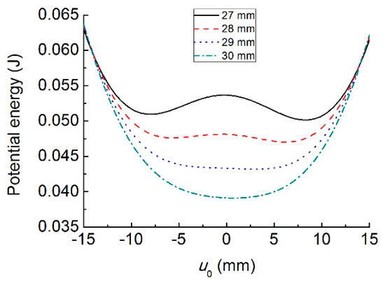 Figure 6 shows the relationship between the system’s potential energy and the transverse displacement difference u0 for different initial separation distance d0. With the decrease of d0, the number of the stable equilibrium point increases from one to two. Correspondingly, the system changes from monostable to bistable state. The dynamic behavior of the bistable structure is very sensitive to the system parameters and external conditions. Meanwhile, the inter-well switching can easily lead the structure to fatigue destruction. Consequently, this paper only focuses on the monostable case. Therefore, d0 is set to be larger than 30 mm.