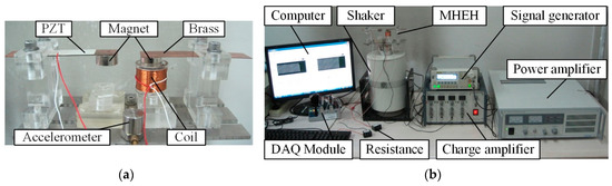 To verify the theoretical model, three macroscale MHEH prototypes were fabricated and an experimental setup was built up, as shown in Figure 7. The substrate of the cantilever beam was made of Phosphor Bronze (ALB Copper Alloys Co., Ltd., Xiamen, China), which was sandwiched between two P-5H piezoelectric (Baoding Hongsheng Acoustics Electron Apparatus Co., Ltd., Baoding, China) layers. Magnet material was NdFeB (N35, Ningbo Hony Technology Co., Ltd., Ningbo, China). The coil was wound with copper wire (Changzhou Wujin Enameled Wire Factory Co., Ltd., Changzhou, China). The geometric and physical properties of the prototypes are shown in Table 1. The experimental setup consisted of an electromagnetic shaker (JZK-50, Sinocera Piezotronics Inc., Yangzhou, China), a signal generator (DG-1022, Rigol Technologies Inc., Beijing, China), a power amplifier (YE5874A, Sinocera Piezotronics Inc., Yangzhou, China), a charge amplifier (CA-3, Qinhuangdao Xinheng Electronic Technology Co., Ltd., Qinhuangdao, China), and an accelerometer (YD64-310, Qinhuangdao Xinheng Electronic Technology Co., Ltd., Qinhuangdao, China). The output voltage and acceleration signal were input into a computer through the data acquisition module (NI 9229, National Instruments Co. Austin, TX, USA) and analyzed with the Labview® software. Unless otherwise specified, the default value of excitation acceleration output from the electromagnetic shaker was set to be 2 m/s2, while the initial center-to-center distance between two magnets in the horizontal direction was 39 mm.