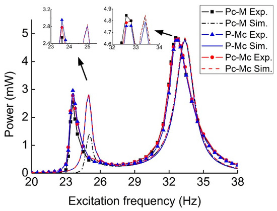 Experimental and simulation output power of the P-Mc type MHEH at different excitation accelerations in the frequency sweep tests.