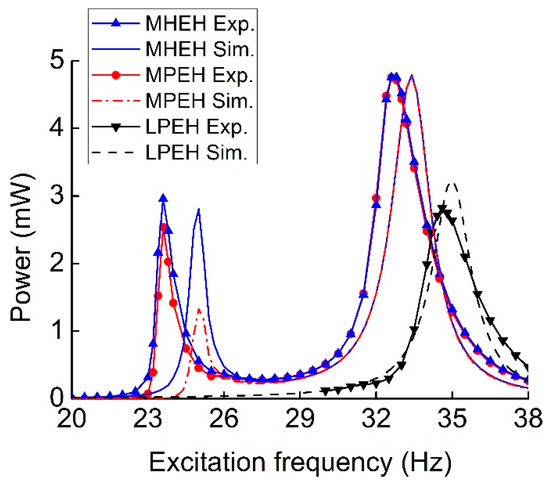 Comparison between experimental and simulation output power for the MHEH, MPEH, and LPEH.