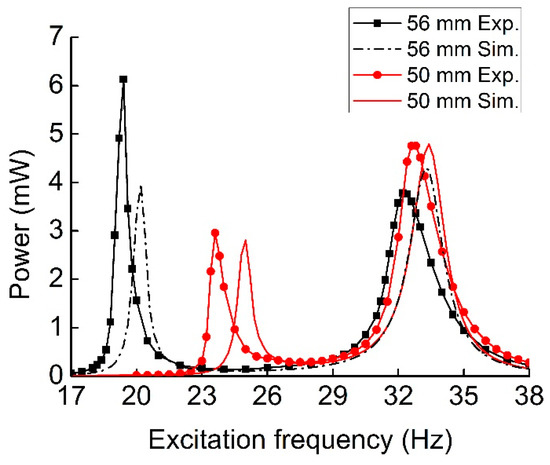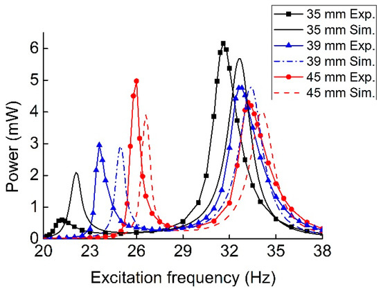 Figure 10 shows the output power of the MHEH for different initial center-to-center distances d0 between two magnets. With the increase of the distance, the resonant frequencies gradually increased and approached the corresponding natural frequencies of two oscillators. Meanwhile, the first peak power gradually increased, whereas the second one decreased. This is because the magnetic interaction between the two oscillators became attenuated. According to the effect of magnetic distance, it needed to make a tradeoff between the resonant frequency distribution and peak output power in practical applications, so as to achieve optimal energy conversion efficiency. As shown in experimental results, it seemed that varying d0 had larger effects on the output power at the first resonance, which was not obvious in simulation results. This was also induced by the change of d0. When the distance was changed, not only the equivalent stiffness but also the damping of the MHEH varied, especially for those of the magnetic oscillator. However, the damping was set to be constant in the simulation.