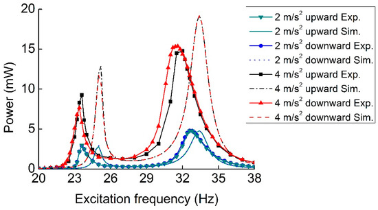 Frequency sweeps can be performed to find the stable states of a hardening or softening system at high-energy and low-energy orbits. Figure 12 presents the output power of the P-Mc type MHEH for excitation frequency upward and downward sweeps under 2 m/s2 and 4 m/s2 excitation accelerations. At the low excitation level, the frequency response from upward frequency sweep was similar to that from downward frequency sweep, just like a linear system. The experimental results agreed well with the simulation results. However, as the excitation level increased, the first resonance shifted to the right and the second one shifted to the left in experimental results, accompanied by jump phenomenon. Thus, more power is generated over dual-directionally broadened bandwidth. Clearly, hardening and softening nonlinear responses occurred at the first and second resonances, respectively. The hardening case was due to the magnetic stiffness and geometric nonlinearity, while the softening case was attributed to the effect of material nonlinearities in the piezoelectric layers [29,30]. It should be noted that there were no such nonlinear responses in simulation results due to the neglect of these nonlinear factors. In the future, a more comprehensive theoretical model will be established to analyze the influences of these nonlinearities, which are not the research focus of this paper.