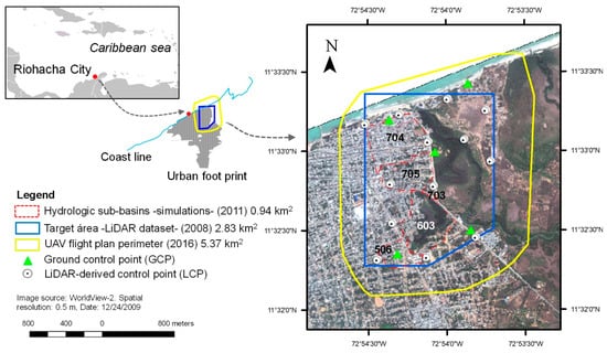 The broader location of the study area is the Northwest part of the coastal city of Riohacha (Colombian Caribbean), shown in Figure 1. This zone is bounded to the North by the Caribbean Sea, to the East by the Ranchería river delta and to the South and West by the inner-city districts. The area under study is a peri-urban zone with the lowest elevations in m above sea level (a.s.l.) within the city bounds, highly exposed to fluvial and pluvial urban floods. The terrain is characterized by a flat relief with occasional undulations; terrain elevations range from 8 m in the South, down to values near 0 m a.s.l. in the North (the coastline). The choice of the study area is based on two criteria: first, local interest due to its high exposure to severe storm flooding, as occurred in the course of El Niño-La Niña (2010/2011) [44,45]; second, the availability of previous hydrological and LiDAR elevation data, outlined by the red and blue lines in Figure 1. Additionally, the Riohacha context was selected as an emblematic case of emerging cities with high population growth rates and vulnerability to natural hazards thus raising scientific interest as shown in Nardini and Miguez [44].