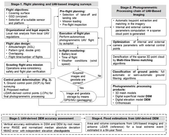 The development of photogrammetry techniques based on Structure from Motion Multi-View Stereo (SfM-MVS) of images acquired by low-cost cameras in unmanned aerial vehicle systems (micro UAV, ≤ 2 kg) has seen a strong development in the last decade [12]. This, together with the SfM-MVS processing in a single workflow, allows the DSM and DEM generation [13,14]. Although one of its main technical drawbacks is the time required for image processing [15]. However, the (relative) flexibility in image acquisition and the increasing offer of robust SfM-MVS processing software, have made UAV photogrammetry a valid low-cost alternative to piloted airborne LiDAR technology [5,14]. Studies show that image based UAV-derived DEMs are comparable to LiDAR for fluvial flood assessment applications [16,17,18,19], such as flood extent and volume estimations. Leitao et al. [20] showed that is possible to obtain detailed DEMs in urban environments from image based UAV platforms with quality comparable to LIDAR data (in terms of the difference between DEMs), and found that a realistic representation (resolution < 1 m), plays a fundamental role in the surface flow modeling. Therefore, it concludes that micro UAVs are a useful solution for describing urban landscapes. In the literature there are more examples of the functionality of UAV images in 2D urban hydrodynamic modelling [21,22], flood risk management and emergency response [23,24], and mapping of difficult-to-access areas [25]. It is widely accepted that the UAV-derived DEM accuracy from SfM-MVS, i.e., aerial or terrestrial photogrammetry processing, is influenced by flight design and planning factors, such as GSD (ground sample distance), inclusion (or not) of oblique images, sensor and camera lens, flight pattern and georeferencing method, etc. [26]. As a rule of thumb in UAV photogrammetry, vertical accuracy for a DEM obtained must be between one and three times the GSD of input imagery [27,28,29]. The impact of the georeferencing method on the accuracy of SfM-MVS products is critical, and also well established in the literature. Georeferencing is usually classified as: (i) direct, by means of UAV navigation (GPS/ IMU) instruments, and sometimes corrected in real time by GPS-RTK [30,31]; and (ii) indirect, through established ground control points [32]. Usually, the classical indirect georeferencing is considered the most accurate method [33]. Depending on the size of the UAV SfM-MVS project, ground control point determination can become a challenging task due to its time-intensive nature [34], and constraints found on the terrain [14].