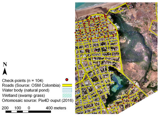 UAV flights were carried out within the framework of a collaborative humanitarian mapping project, “Mapatón por La Guajira” in February 2016 [46]. The main UAV flight objectives were: (1) To generate an orthophoto for object digitalization under the OpenStreetMap standard; (2) to survey an area greater than the one previously available in elevation and hydrological datasets for UAV flood research (Figure 1). The eBee™ SenseFly UAV platform was used in this study (Appendix A, Table A1). The system is equipped with consumer-grade on-board Global Positioning System (GPS) and inertial measurement Unit (IMU) modules for autonomous navigation and further image geotagging. The payload was a non-metric RGB camera with a CMOS active pixel sensor technology.