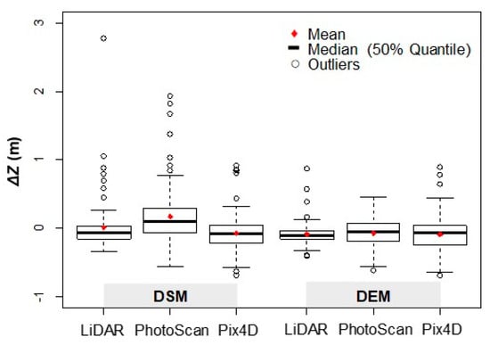 As can be seen in Figure 5, the errors obtained for the considered models (LiDAR, PhotoScan and Pix4D) are greater for DSMs than for DEMs, with the highest errors obtained with PhotoScan. This difference in dispersion values may be due to reprojection errors (1.97 in PhotoScan vs. 0.19 in Pix4D) and camera optimization (1.90% in Photoscan vs. 0.21% in Pix4D).
