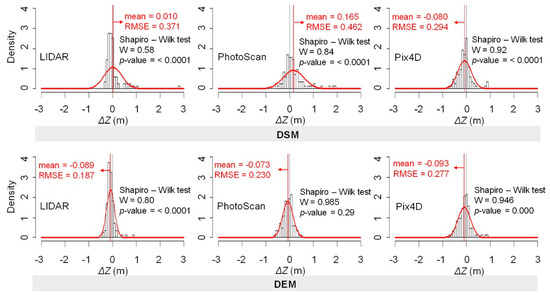 The absolute value of the average error for the considered models is below 10 cm, except for the DSM obtained from PhotoScan, which is 16.5 cm (Figure 5 and Figure 6), although the sign of the average value indicates that the models are either above or below the employed checkpoints. In addition, normality tests indicate that errors do not follow a normal distribution (except PhotoScan DEM), which implies that the RMSE estimators are in this case not suitable. From this, it can be considered that the obtained mean value of the error is underestimated. It is kept here for comparison only. Given the lack of normality of the errors, robust estimators are applied (Table 4).