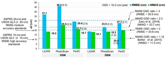 Figure 7 compares absolute and relative values of the expected accuracy of each UAV model with the standard LiDAR reference. For DSMs the accuracy value of PhotoScan is lower than that of Pix4D but is found to be near the expected range. For DEMs the values are similar for all models and the accuracy of PhotoScan is remarkably improved. The average accuracy values lie within the expected range and are close to the observed ones in the LiDAR reference. DEM accuracy can be mostly explained by differences in the operator's interaction with the SfM-MVS software.