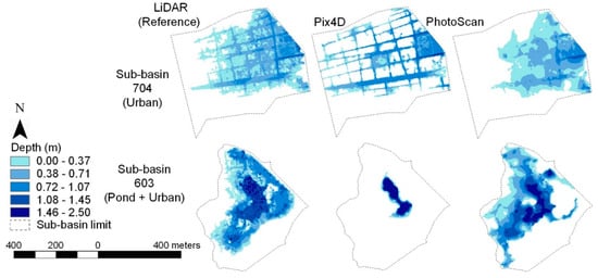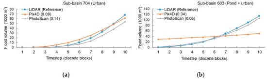 Figure 9 shows that for the Pix4D model in Sub-Basin 704 the volumes obtained for each timestep are closer to those of the reference, although slightly higher. For PhotoScan, flooded volume estimations are always below the reference. In Sub-basin 603, where the pond is located, the flood extent of the Pix4D model is reduced to the water body, whereas PhotoScan’s is much closer to the reference.
