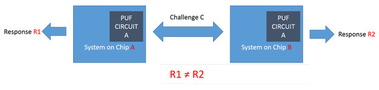 Two identical physical unclonable functions (PUFs) circuits on two different chips generate different responses.
