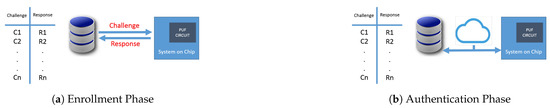 PUFs generally are used for authentication and secure communication. Since PUF-based authentication does not require classical cryptographic assets, it fits properly into the resource demands of IoT devices. PUF authentication protocols have two phases: the enrollment and the authentication phase [14]. The first proposed PUF-based authentication protocol [15] works as follows: During the enrollment phase (see Figure 2a), the chip which contains the PUF circuit is directly connected to the server. The server sends challenges, and the PUF circuit sends back the responses. The server stores all CRPs in a table. Then, the chip will be mounted into the IoT device. During the authentication phase (see Figure 2b), if the device needs to be authenticated by the server, the server sends an arbitrary PUF challenge to the device. The device measures the PUF and sends back the generated response bits. If the measured response matches the stored response in the server database, then the device is authenticated. Another traditional application for a PUF is to extract a key from the PUF response to establish an encrypted communication [16,17]. This is out of the scope of this paper.