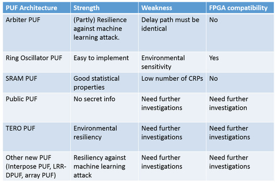In this section, we discuss the proposed PUF architectures for IoT applications, and we look into the strengths and weaknesses of each architecture. Figure 3 provides an overview.