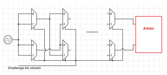 An Arbiter PUF [42] as shown in Figure 4 works by comparing two delay paths of equal length and generates a “0” or a “1” as the result of this comparison. Although the two paths should have the same delay, due to microscopic variations, one of them is actually faster than the other. The challenge is used to determine the two paths that are used dynamically. To do so, the individual bits of the challenge are used as the input into a series of interconnected multiplexers. Depending on the input, each multiplexer decides the next multiplexer to switch its output. This generates numerous combinations of possible paths.