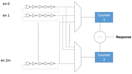 A Ring Oscillator (RO) PUF is built from several identical ring oscillators (see Figure 5). Suppose there are ROs, and each one of them oscillates with its own frequency (for the first RO) to (for the last RO). By comparing the two RO frequencies, either “0” or “1” will be generated. Each incoming challenge determines the pair of ROs that is used. In theory, all ROs’ oscillation frequencies should be the same; however, manufacturing process variations caused slight differences in this term. Note that RO PUFs that use such non-exclusive RO comparisons may lead to bias responses. A solution for this issue is discussed in [47].