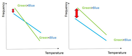 RO PUFs are strong PUFs (Criterion 3), and the main reason behind using them for FPGA-based IoTs is their easy implementation on FPGA (Criterion 4). They have good statistical properties (Criterion 2) [7,17]. One of the drawbacks of RO PUFs is sensitivity to environmental conditions. As an example, a response bit flip can happen due to temperature variation if RO pairs have adjacent frequencies (see Figure 6). This makes RO PUFs a good candidate for active side channel attacks (Criterion 1). Although a solution for this has been proposed [48], it is only applicable to ASICs.