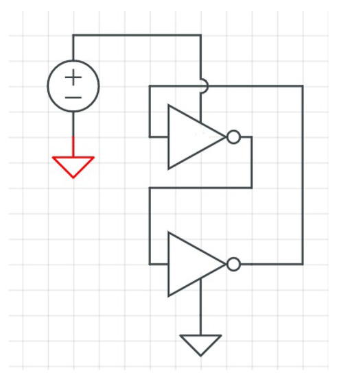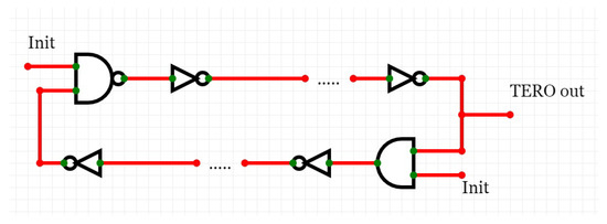 There are other PUF architectures that have recently been introduced as an alternative solution for IoT devices. Transient Effect Ring Oscillator (TERO) PUFs [58,59] (see Figure 8) are an alternative to RO PUFs. Initial results [59,60] indicate that this architecture is not susceptible against cloning by electromagnetic analysis [61] or electromagnetic injections [62]. A TERO PUF structure is similar to that of an RO PUF, but is constructed from TERO cells that have two states: a transient oscillating state and a stable state [60]. The basic structure of a TERO PUF is an RS flip flop. By setting the init signal to one, the circuit starts oscillation for a short period of time.