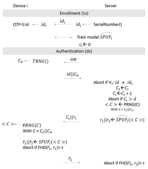 - Gao, Y.; Li, G.; Ma, H.; Al-Sarawi, S.F.; Kavehei, O.; Abbott, D.; Ranasinghe, D.C. Obfuscated challenge-response: A secure lightweight authentication mechanism for puf-based pervasive devices. In Proceedings of the 2016 IEEE International Conference on Pervasive Computing and Communication Workshops (PerCom Workshops), Sydney, NSW, Australia, 14–18 March 2016; pp. 1–6. [Google Scholar]