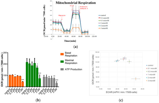 Effect of FCCP on mitochondrial respiration. (a) OCR changes in response to ATP synthase inhibitor (1 μM oligomycin), uncoupler (2 μM FCCP), and ETC blockade (1 μM rotenone plus 1 μM antimycin). (b) Basal respiration, maximal respiration, and ATP production measured of FCCP-treated hMSCs by Seahorse XF-24 extracellular flux analyzer. The mitochondrial functions were measured after hMSCs were treated with FCCP of 0, (control, n = 19), 0.1 (n = 11), 0.3 (n = 11), 1 (n = 24), 2 (n = 13), and 3 (n = 14) μM for 20 h. Data are presented as the average OCR ± standard error. * p < 0.05, ** p < 0.01, *** p < 0.001. (c) The ratio of fundamental respiration. The ratio of OCR to ECAR can indicate overall preference for OXPHOS versus glycolysis. Data are presented as the average OCR or ECAR ± standard error.
