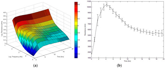 ECIS measurement of hMSC attachment and spreading. At time zero, hMSCs were inoculated in an ECIS well giving a final cell density of 40,000 cells per cm2. (a) Three-dimensional representation of the changes in resistance as a function of frequency and time during the attachment and spreading of hMSCs on a sensing electrode. (b) Changes in resistance as a function of time measured at 4 kHz. Data obtained from eight electrode wells were averaged and presented as mean ± standard error.