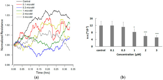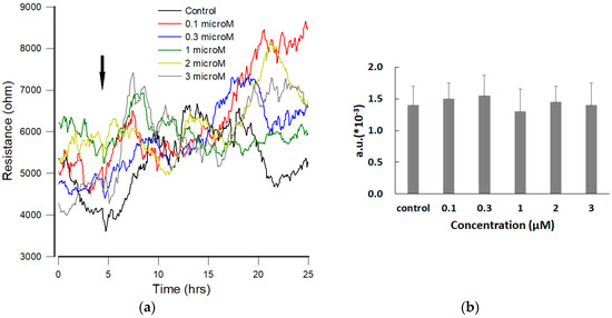 - Giaever, I.; Keese, C.R. Micromotion of mammalian cells measured electrically. Proc. Natl. Acad. Sci. USA 1991, 88, 7896–7900. [Google Scholar] [CrossRef]
