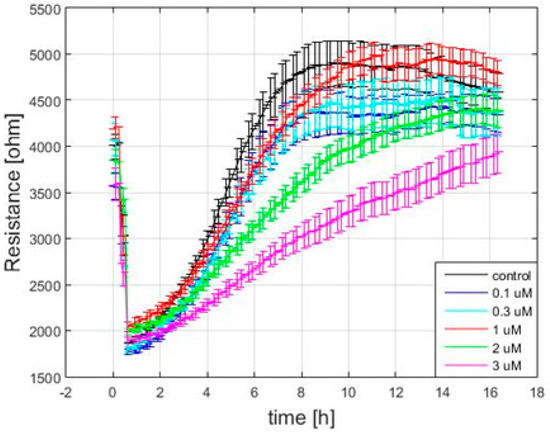 The resistance time series of wound healing migration measured at 4 kHz. The measurements were taken 20 h after hMSCs were exposed to 0.1 (n = 20), 0.3 (n = 32), 1 (n = 28), 2 (n = 32), 3 (n = 25) μM of FCCP and culture medium as control (n = 36).