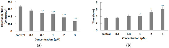 (a) Hill slope and (b) T50 values obtained from the ECIS wound healing assay of hMSCs in response to various concentrations of FCCP. Significance was calculated by comparing each experimental group with the control group. Values shown are mean ± standard error. * p < 0.05; ** p < 0.01; *** p < 0.005.