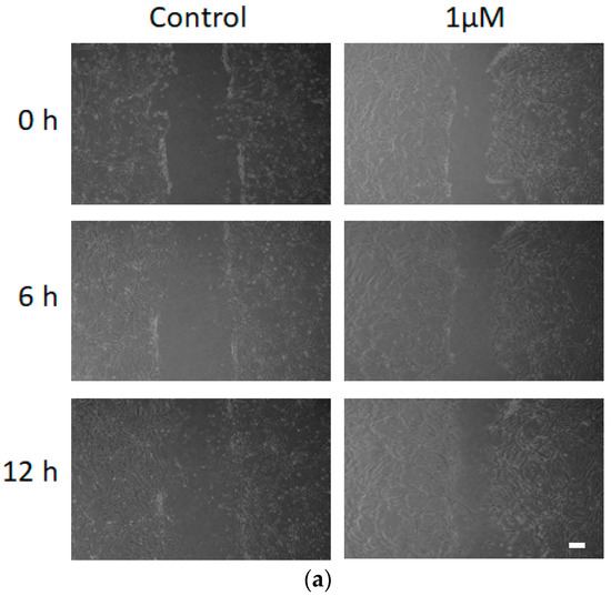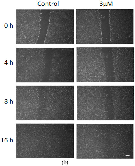 Time-lapsed images of scratch wound-induced migration of hMSCs after they were cultured in the culture medium without (control) and with (a) 1 μM and (b) 3 μM FCCP for 20 h. Gaps were created by gently dragging a 200 µL pipette tip across the bottom of the 35-mm cultured dishes. Scale bar is 100 μM in length.