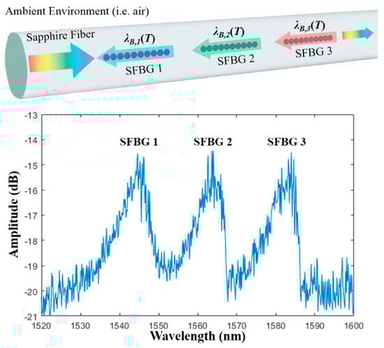 Three SFBGs were inscribed in a 125 μm-diameter air-clad single-crystal sapphire fiber (MicroMaterial Inc., Tampa, FL, USA) via the point-by-point method with a femtosecond pulsed laser. The details of the fabrication procedure are described in previous work [15] and the grating configuration is shown in Figure 1b. The choice of the point-by-point method instead of the one via phasemask [11,14] is due to its excellent flexibility in fabricating cascaded SFBGs. When a broadband light is launched into a SFBG, only the light at or near the Bragg wavelength shows strong constructive interference and is efficiently reflected. The Bragg wavelength is defined as [18]: