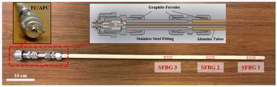 The sensing fiber was packaged in a customized “tube-in-tube” design, as illustrated in Figure 3. The sapphire fiber was inserted in a high-purity alumina ceramic tube (Inner Diameter (ID): 1.57 mm, Outer Diameter (OD): 4.75 mm). There was no fixation of the fiber, which lay freely on the inner wall. This assembly was then inserted into another ceramic tube (ID: 6 mm, OD: 13 mm) with one sealed end. Customized stainless steel tube fittings were designed to secure the ceramic tubes, as shown in the inset of Figure 3. Given the rigidity of alumina and the potential thermal expansion mismatch, compressive fittings with soft graphite ferrules instead of epoxy were used to centralize and fix all tubes in place. A female standard FC/APC connector was installed at the end of the probe, eliminating the need for on-site splices and simplifying the installation process for the sensor probe. The details of all the components are listed in Table 1 and no special cleaning or care was performed for all the material before the packaging.