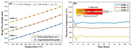(a) Calibration of the temperature response of the SFBGs, where λ (nm) is the measured wavelength, λ0 (nm) is the Bragg wavelength at room temperature, and T (°C) represents the temperature. (b) Evolution of the demodulated temperature during the 110-h isothermal test. The insert shows the configuration of the FBGs during the test. Note: SFBG = sapphire fiber Bragg grating. FBG = fiber Bragg grating.