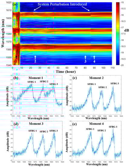 After the first 10 h, the evolution of the spectrum continues due to the intermodal coupling induced by the fluctuation of the ambient environment, such as temperature and vibration. In addition, perturbation to the system was deliberately introduced at 23 h and 86 h by repositioning the leading fibers or rotating the probe. Sudden changes of the spectral shape were observed (vertical lines in Figure 6a), which further confirms that the spectral shape is highly sensitive to the modal excitation and intercoupling. By comparing the spectra at different moments (see Figure 6c–e), the intermodal coupling induced by either ambient variation (Moment 2 and 3) or manual perturbation (Moment 3 and 4) mainly affects the ripples on a reflection peak. However, the overall spectral shape is relatively stable. Hence, peak fitting remains a simple and effective approach to characterize the reflection spectrum of a SFBG. The standard deviation values of the Bragg wavelength demodulated with the peak fitting method after the first 10 h were 0.19 nm, 0.14 nm, and 0.11 nm for SFBG 1, SFBG 2, and SFBG 3, respectively.