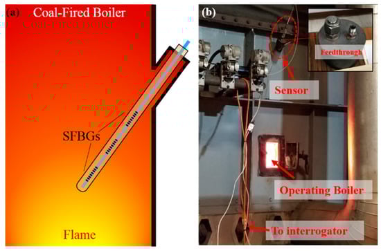 Sensor deployment in a coal-fired boiler: (a) scheme for the configuration of the sensor (thermocouple not shown); (b) picture of the deployment site.