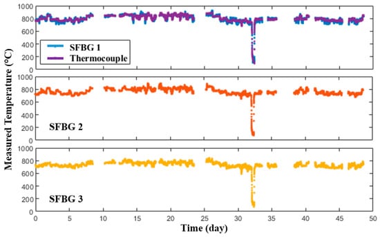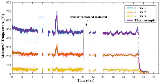 The sensing system operated for over 42 days and experienced a peak temperature of ~700 °C. In general, the temperature of the boiler was determined by the actual demands for power in the local area. Two distinct events were successfully detected during the test. The first one is a surge of temperature around Day 9, due to unexpected cold weather in the local region. The second one is a decrease of the temperature around Day 41, due to the routine maintenance of the boiler. The temperature gradient within the boiler can be readily seen by the temperature measurements provided by the three SFBGs, as shown in Figure 8. Furthermore, the prototype sensor measurements were consistent with those provided by the thermocouple co-located with SFBG 1. By taking the thermocouple as the reference, the measurement error during the entire test period was within 20 °C and the standard deviation was 8.01 °C. The loss of temperature readings during the test was due to loss of power to the light source and was easily remedied by returning power to the unit. The loss of readings for ~14 days starting from Day 15 was due to damage to the interrogation system and components that appeared to be due to the local environment and incorrect handling of the operation team. However, the sensor probe remained installed during the entire test period. Unfortunately, the sensor probe broke at the end of the test due to improper handling. Thus, its performance after the retrieval was not evaluated.