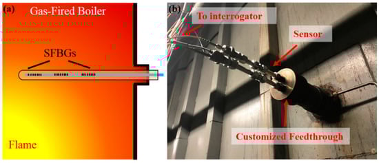 Sensor deployment in a gas-fired boiler: (a) scheme for the configuration of the sensor (thermocouple not shown); (b) picture of the deployment site.