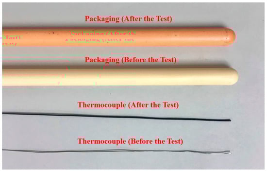 Picture of the physical appearances of the packaging and thermocouple before and after the test.