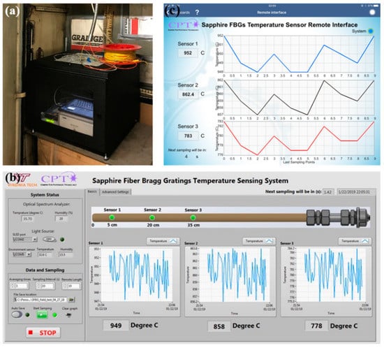 Single-crystal sapphire fibers are attractive for construction of sensors for various harsh environments owing to sapphire’s high melting point (~2040 °C), chemical stability, and optical transparency [8,9,10,11,12,13,14,15,16,17,18,19,20,21,22,23,24,25]. Distributed temperature sensing based on single-crystal sapphire fiber has been reported via Raman backscattering [12] or multiplexed fiber Bragg gratings (FBGs) [13,14,15,19]. Though the Raman backscattering-based sensing offers fully distributed measurements, the low Raman scattering cross-section of sapphire demands use of a high power laser, highly sensitive detection system, and a long exposure time, which raises the cost of the sensing system [12,16]. Nevertheless, FBGs have been demonstrated as effective sensing elements to achieve quasi-distributed sensing with flexible configurations, a fast response time, and low costs [17,18,19,20,21,22,23,24,25,26,27]. FBGs in single-crystal sapphire (SFBGs) have been demonstrated for sensing applications up to 1900 °C [22]. In this regard, the temperature response of SFBGs is twice as sensitive when compared to fused silica, owing to sapphire’s larger thermal expansion coefficient [22]. Although various SFBG-based sensing applications have been reported, to the best of our knowledge, this reported work primarily evaluates the sensing performance in a laboratory environment or under a controlled environmental conditions [11,13,14,15,19,20,21,22,23,25]. However, the deployment and evaluation of a sensor in the real field environment is crucial and offers valuable information for practical applications.