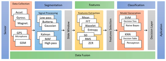 The data fusion step is a cross-process used to combine data from multiple sources. This cross-sectional aspect occurs because the data can be combined in any of the steps described above. For example, (i) in the data collection and segmentation steps where signal fusion techniques such as Magnitude can be applied, (ii) in the feature extraction step where the strategy of concatenating vectors of features can be applied, and finally (iii) in the classification step where an ensemble of classifiers can be used to aid in the inference decision. All these strategies aim to enhance the accuracy of activities classification. Section 5.3 contains more details about data fusion strategies.